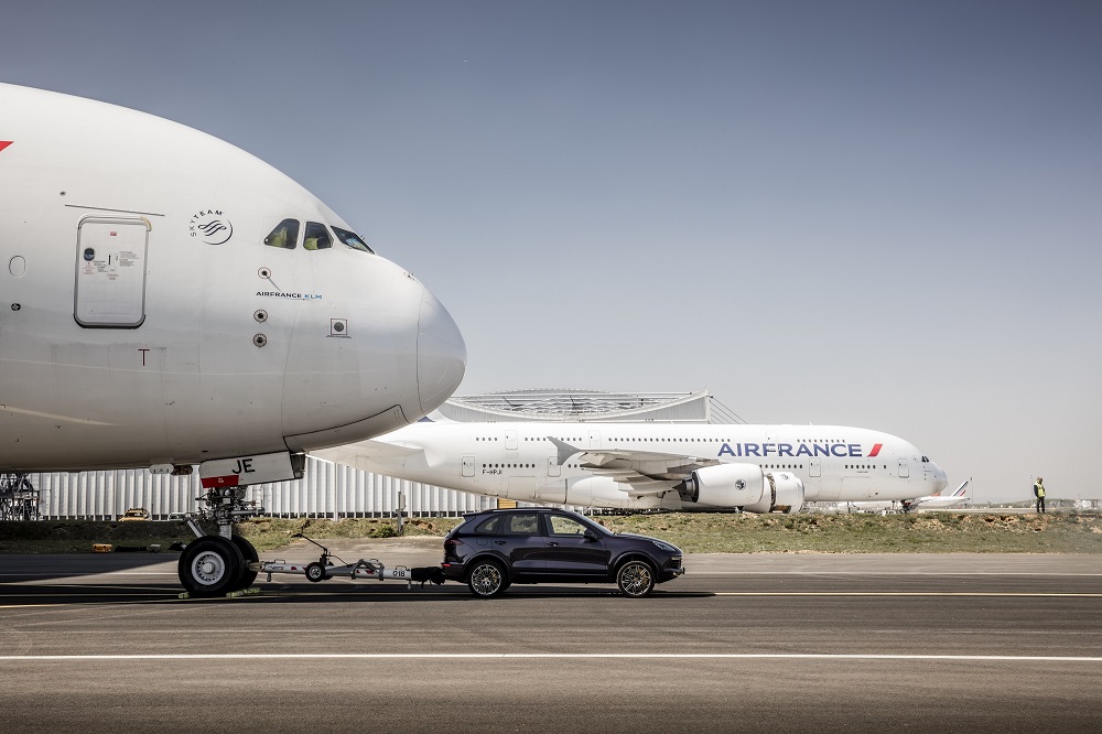 Μία Porsche Cayenne τράβηξε με επιτυχία ένα Airbus A380 (ένα από τα μεγαλύτερα αεροπλάνα του κόσμου) της Air France, βάρους 285 τόνων.