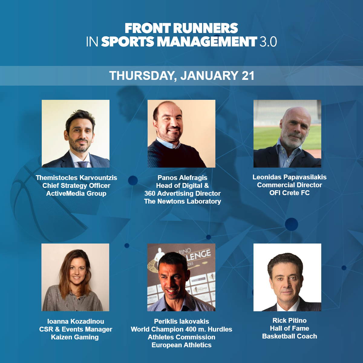 Το μοναδικό για τα ελληνικά δεδομένα, συνέδριο για το αθλητικό management πλησιάζει. Επιφανείς άνθρωποι του χώρου τόσο από την Ελλάδα, όσο και από το εξωτερικό «συναντώνται» στο web conference “Front Runners in Sports Management 3.0” που διοργανώνει η πολυβραβευμένη ActiveMedia Group μαζί με το Sports Management Society του Deree – Αμερικανικού Κολλεγίου Ελλάδος την Πέμπτη 21, την Παρασκευή 22 και το Σάββατο 23 Ιανουαρίου 2021.