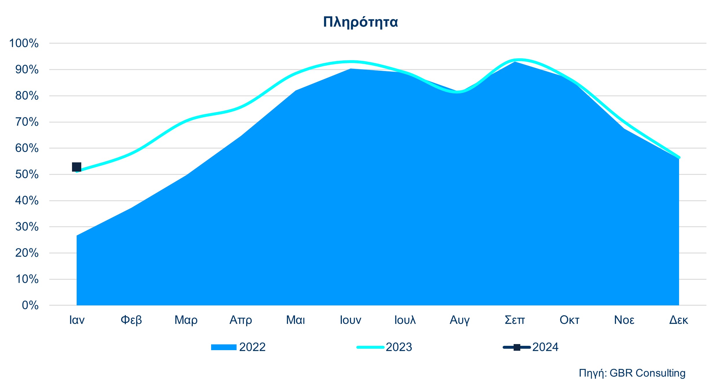 Θετικά θα χαρακτηρίζονταν τα πρώτα μηνύματα της νέας χρονιάς για τα ξενοδοχεία της Αθήνας σύμφωνα με τα στοιχεία κίνησης και απόδοσης που συγκεντρώνει η Ένωση Ξενοδόχων Αθηνών – Αττικής και Αργοσαρωνικού σε συνεργασία με την GBR Consulting. Ο Ιανουάριος 2024 ‘έκλεισε’ με μέση πληρότητα 52,8% (έναντι 51,2% του 2023), παρατηρείται δηλαδή αύξηση της τάξης του 3,1%.
