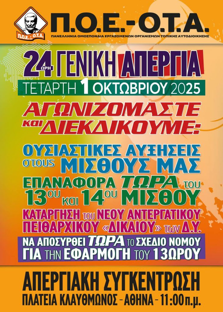 - Υγεία: Η ΠΟΕΔΗΝ καλεί σε συγκέντρωση στην Πλατεία Κλαυθμώνος, καταγγέλλοντας «δραματική υποστελέχωση του ΕΣΥ» και διεκδικώντας μονιμοποιήσεις συμβασιούχων και αυξήσεις μισθών.